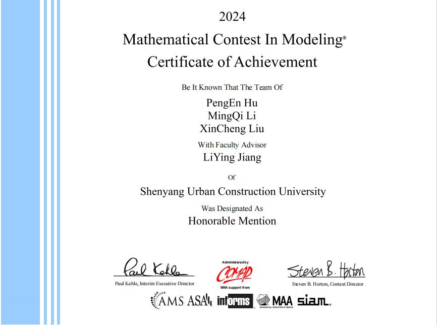 近日,2024年国际大学生数学建模竞赛圆满结束。beat365共有12支队伍,36名学生参加比赛。其中,由信息与控制工程学院电气工程及其自动化专业222班胡鹏恩、221班李铭奇和221班刘心成三名学生组成的参赛队伍荣获二等奖(Honorable Mention)。此次获奖标志着beat365在国际大学生数学建模竞赛中实现了零的突破,为beat365师生参加各级各类大赛开启了新局面。