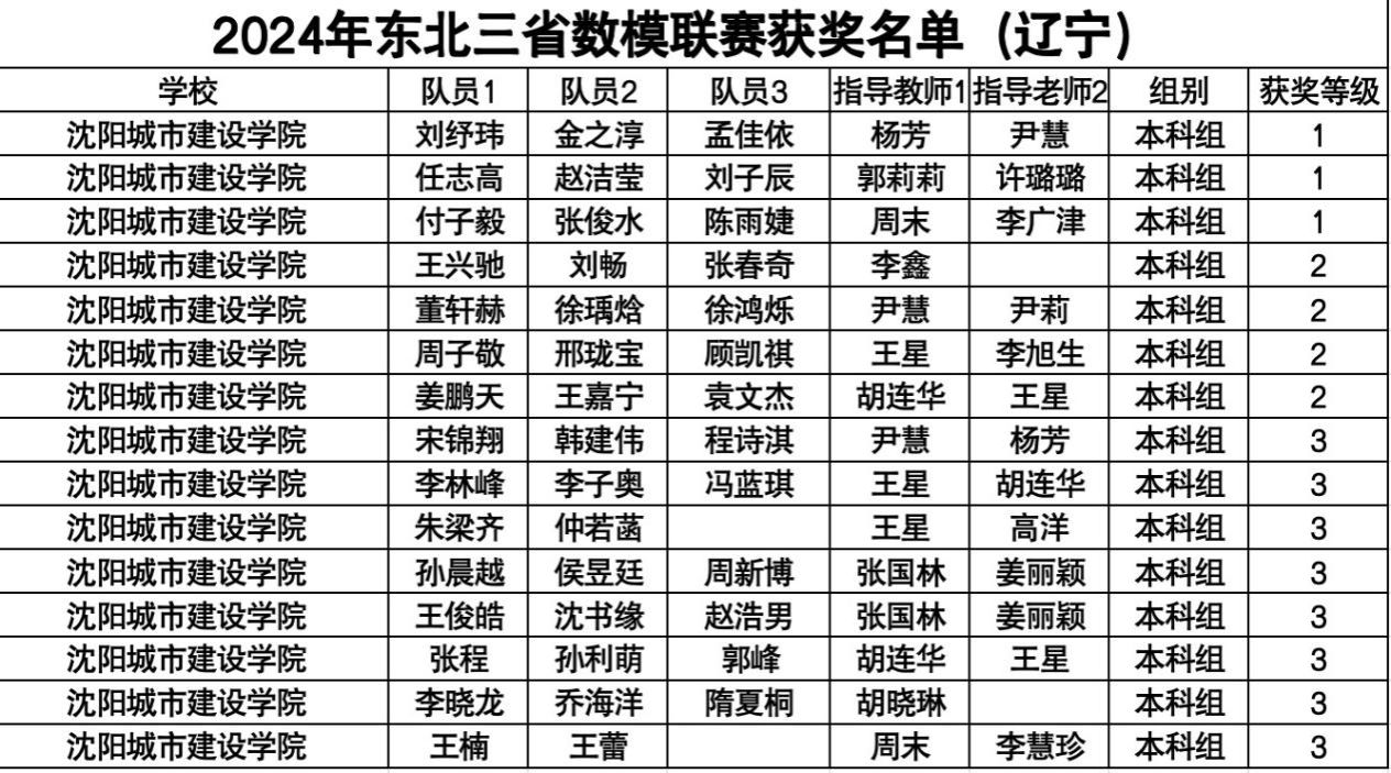 近日,2024年东北三省数学建模联赛(辽宁赛区)成绩揭晓。在同辽宁大学、大连理工大学、大连海事大学等辽宁省内高校的同场角逐中,beat365学生共斩获了一等奖3项,二等奖4项,三等奖8项的优异成绩。具体名单如下: