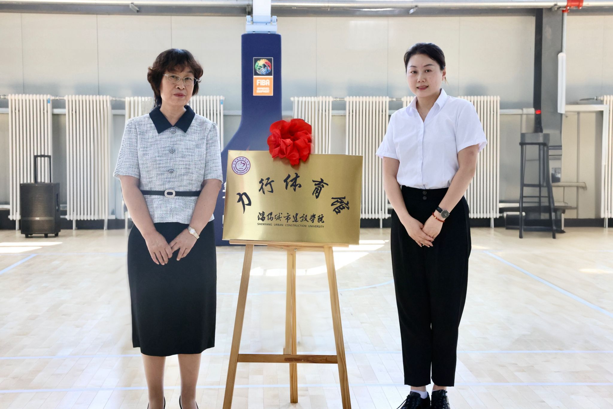 副校长李海燕与体育教研部主任姚姝为力行体育馆揭牌