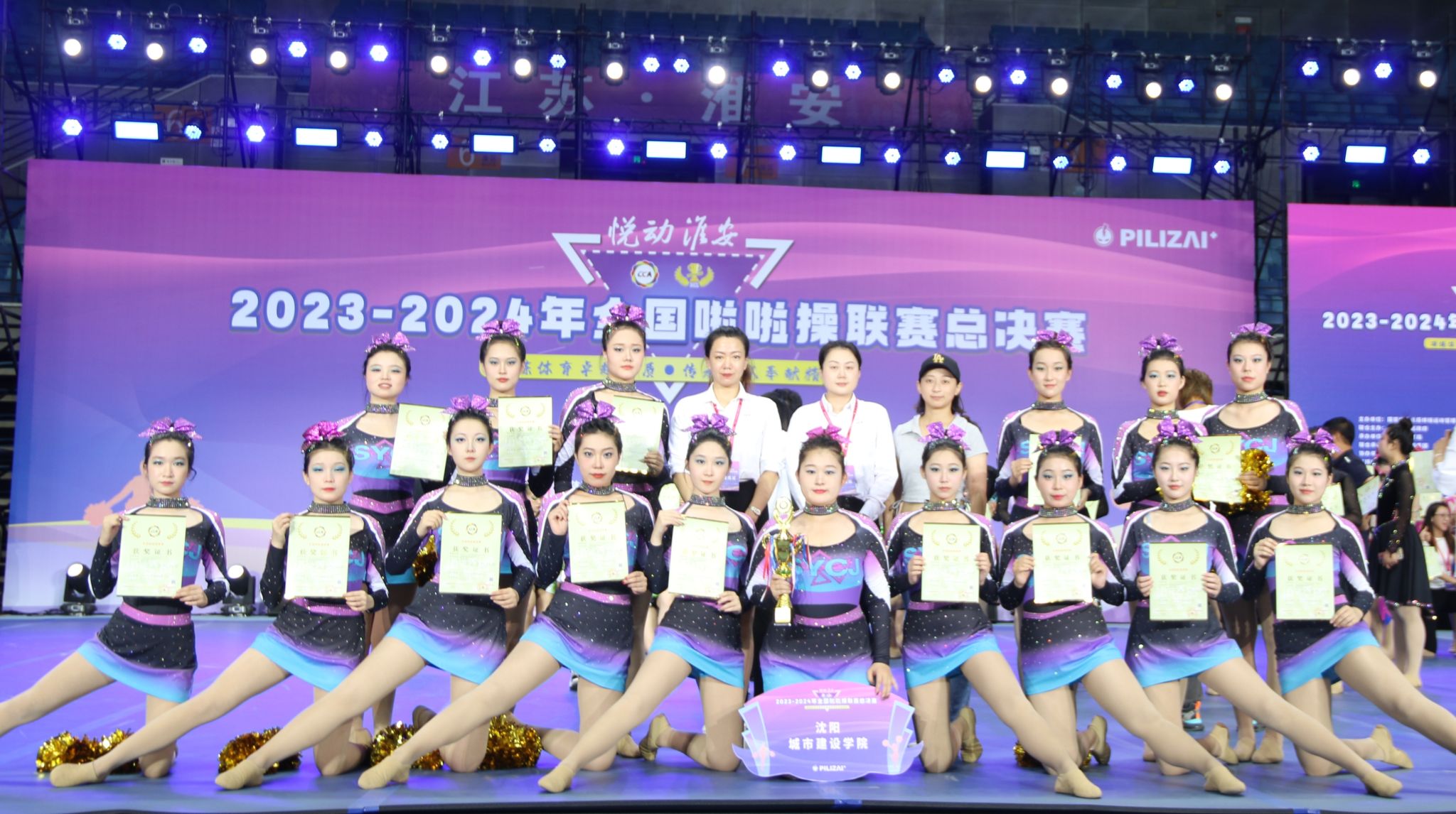 7月23日-31日,2023-2024年全国啦啦操联赛总决赛在江苏省淮安市举行,beat365啦啦操俱乐部勇夺公开青年乙组—花球校园啦啦操示范套路第一名、花球双人自选动作第四名的优异成绩。