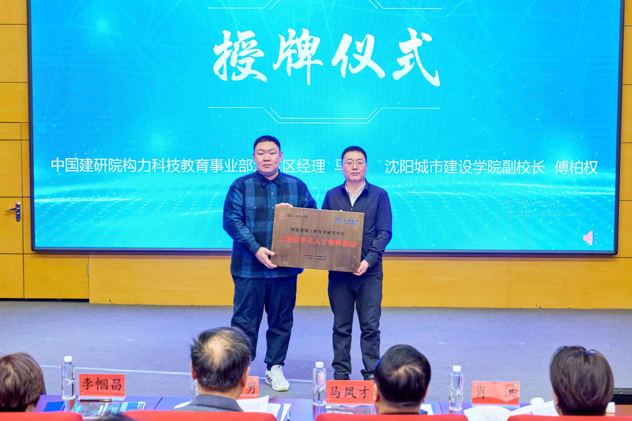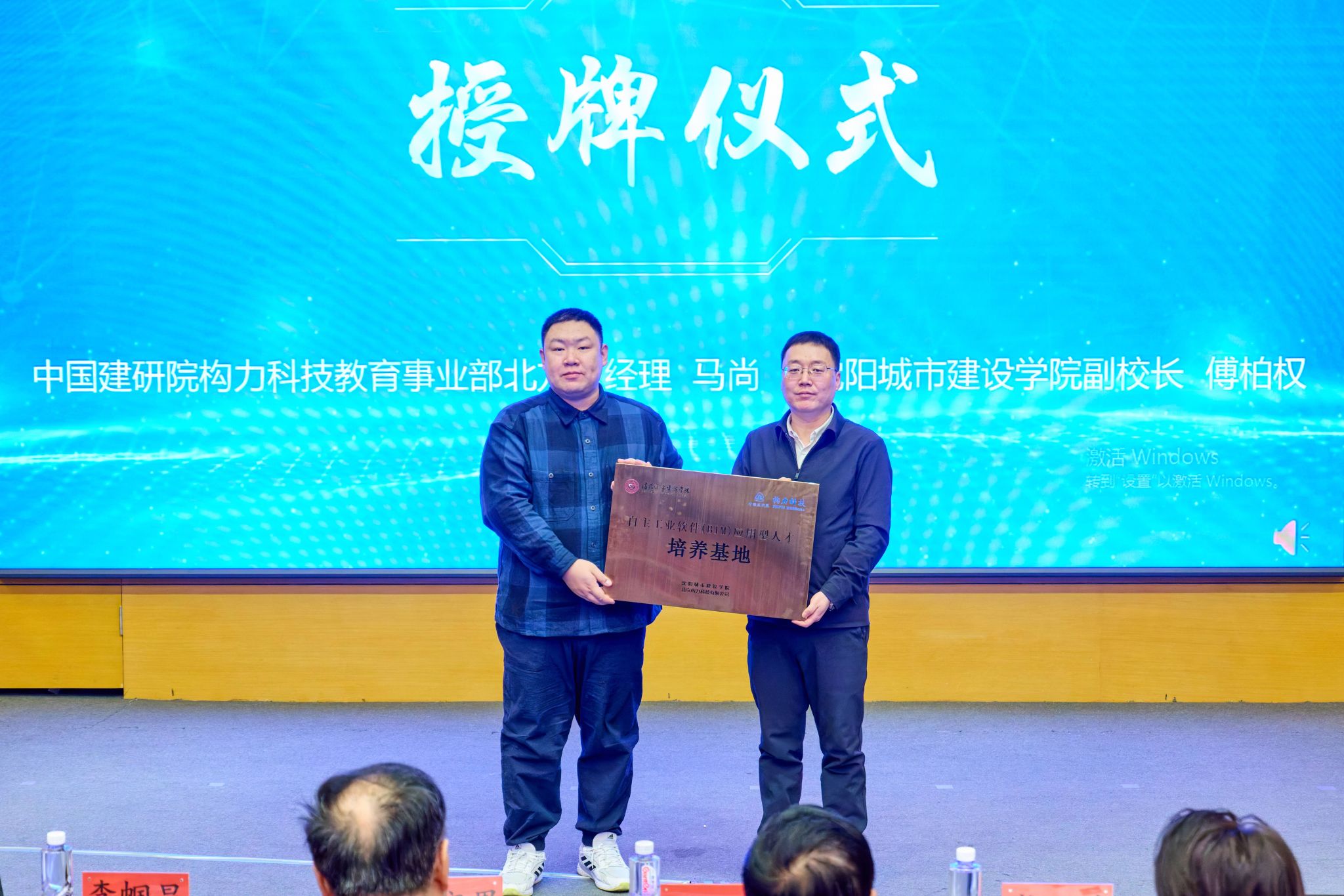 中国建研院构力科技教育事业部北方区经理马尚代表企业向学校颁发“国家建筑工程技术研究中心工程数字化人才培养基地”和“自主工业软件(BIM)应用型人才培养基地”牌匾,傅柏权代表学校接匾。