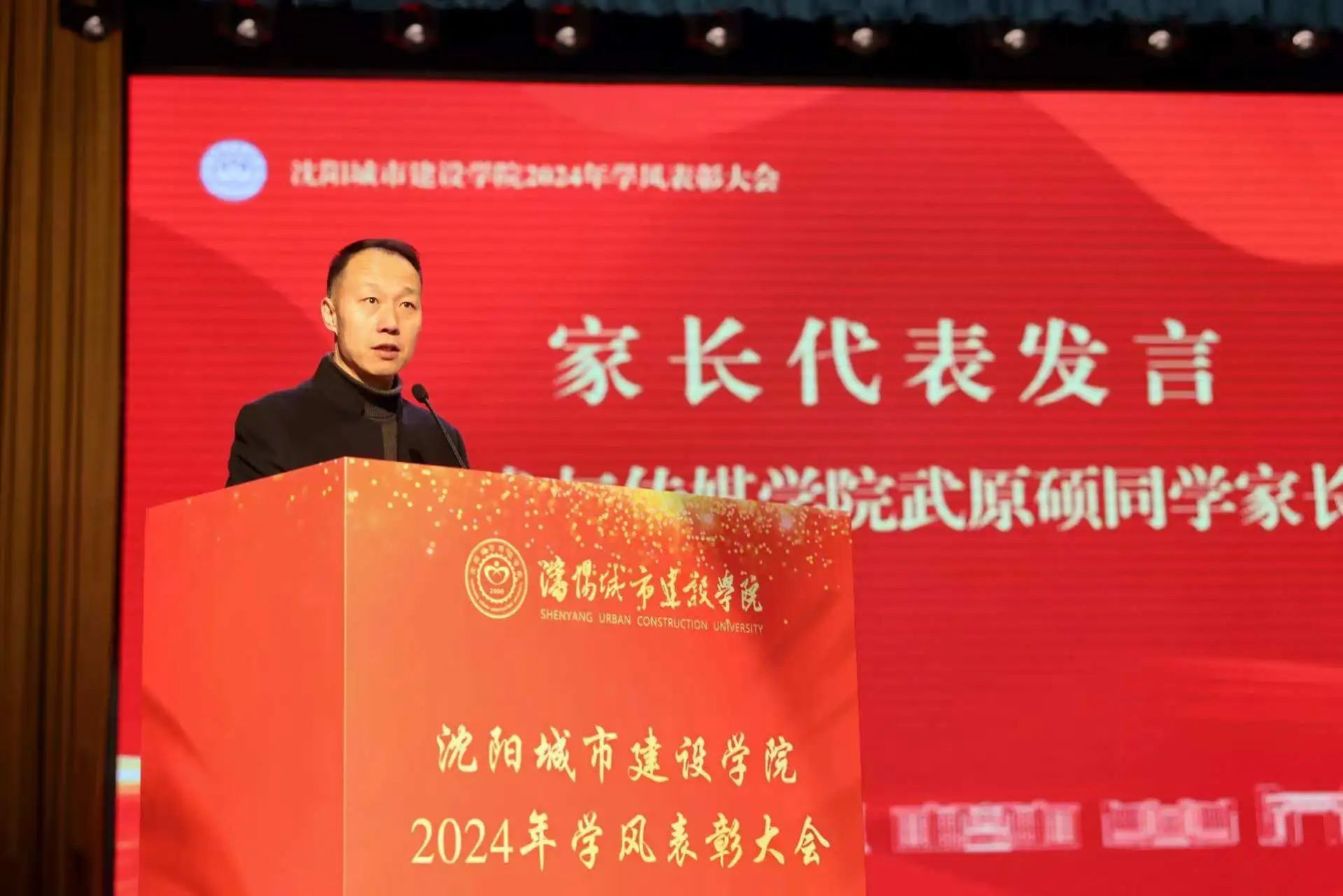 艺术与传媒学院网络与新媒体专业武原硕父亲武仲勇代表优秀学生奖学金学生家长发言。他深情地叙述了孩子入学以后的蜕变和成长,真挚地表达了对学校的感激之情,也号召所有家长与学校携手并进,共同引领孩子们成长为有用之才、幸福之人。