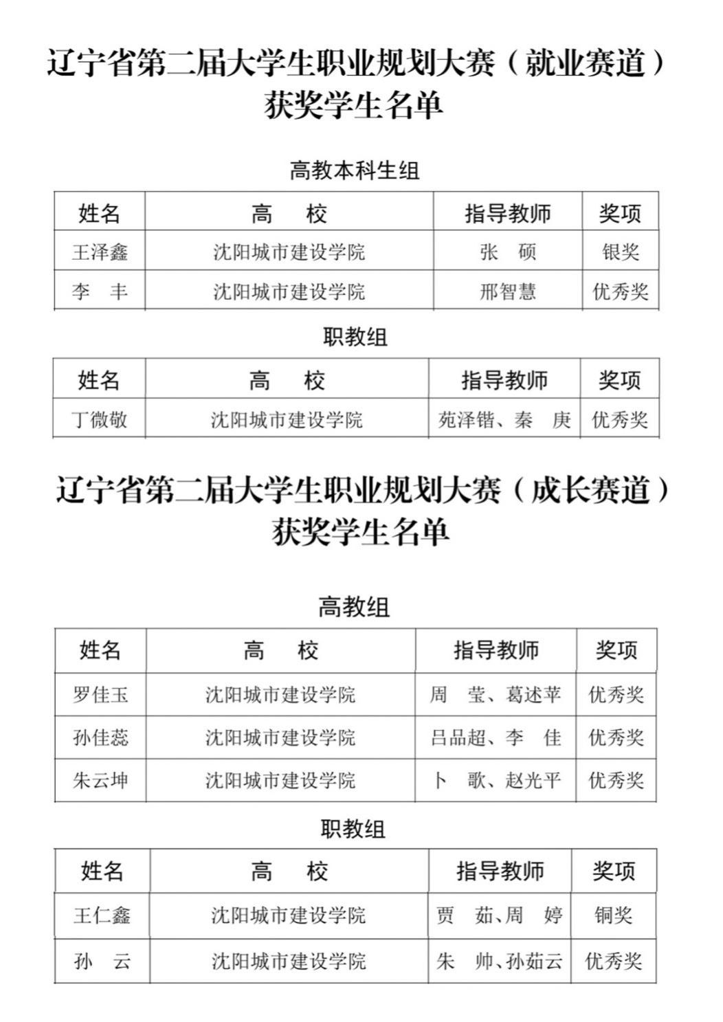 近日,辽宁省教育厅下发了《关于公布辽宁省第二届大学生职业规划大赛获奖名单的通知》(辽教通〔2025〕78号),beat365王泽鑫、李丰等8名学生分别在就业赛道、成长赛道中荣获银奖一项、铜奖一项、优秀奖6项,此次获银奖、铜奖实现了参加本赛事的新突破。