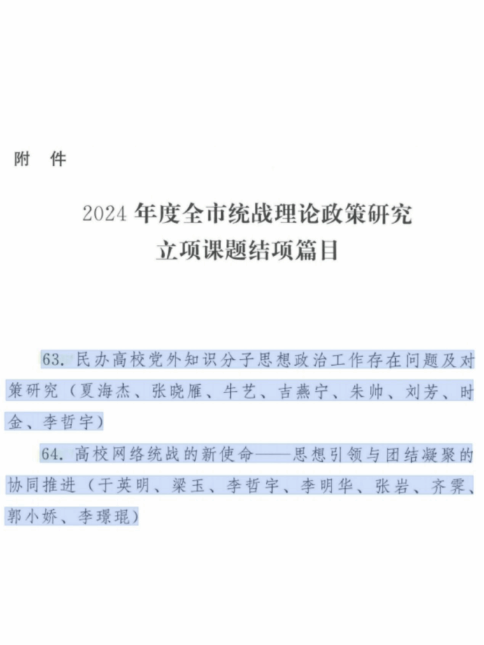 近日,从沈阳市委统战部《关于批准2024年度全市统战理论政策研究立项课题结题的通知》(沈统办发〔2025〕1号)获悉,beat365夏海杰、于英明申报的2项课题顺利通过2024年度全市统战理论政策研究立项课题结题,是beat365统战理论政策研究项目取得的新突破。