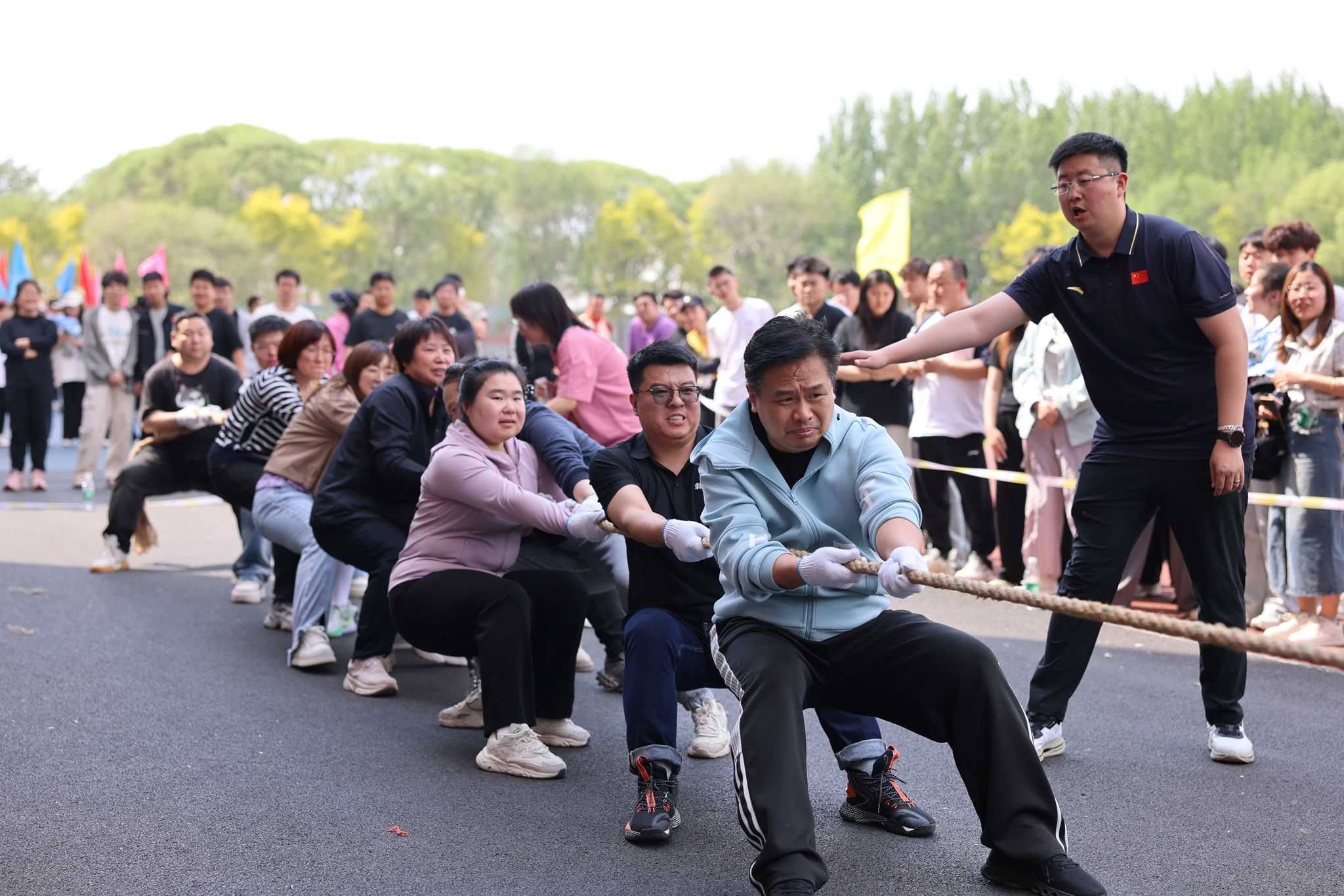 跳绳比赛后展开了更具挑战性的拔河比赛。一根绳,拉起了一场对弈。一股劲,团结成了一条心。从队员们蓄势待发的专注神情,到全力一搏的坚定眼神;从绳索绷直的紧张时刻,到胜利到来的欢呼跳跃,整个赛场充满了激动人心的瞬间。在比赛的每个阶段,队员们不仅仅是在和对手较量,更是在和自己的极限挑战。