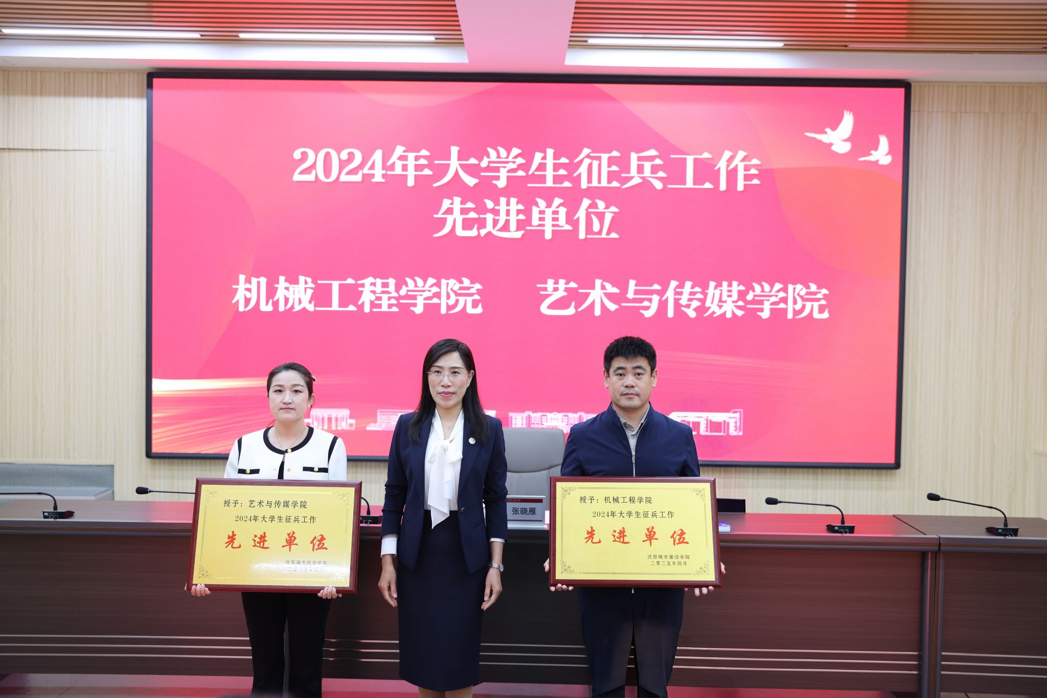 张晓雁作动员讲话。她向受到表彰的单位和个人表示祝贺,并对全校各部门在2024年征兵工作中取得的成绩和付出的努力表示肯定。她强调,征兵工作不仅为国防事业贡献力量,更彰显了学校培养学生成长成才的育人情怀。张晓雁从“政治站位、服务保障、宣传动员”三个方面作工作部署。一是要树立大局意识,强化责任担当,以全局视野锚定使命,以问题导向找准坐标,以系统思维凝聚合力。确保征兵工作每一个环节有人负责,每一项任务落实到位,以高度的使命感和责任感完成征兵指标;二要坚持多措并举,精准服务关怀,以机制创新打通堵点,以精准服务化解疑虑,以全程关怀优化生态。做好学生从参军到退伍的全过程服务,严格落实相关文件精神,加大对学生的关心、照顾力度,化解学生和家长的疑虑;三要统筹宣传矩阵,实现思想浸润,以时效引领强化浸润,以价值阐释激发共鸣,以多维矩阵扩大声量。要将国防教育与课程思政和日常思想政治教育相融合,厚植学生家国情怀,引导学生树立“携笔从戎,报效国家”的价值观,创新宣传方式,扩大宣传力度,营造浓厚的参军氛围。