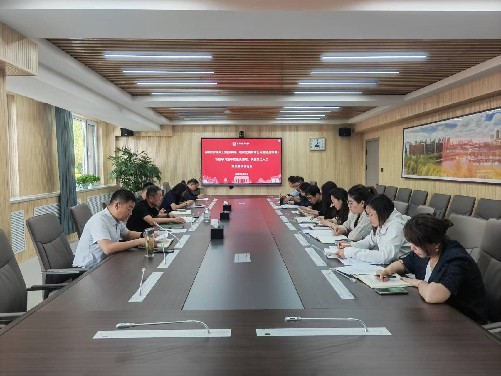 为扎实做好深入贯彻中央八项规定精神学习教育,加强学校党风廉政建设,切实增强党员干部廉洁意识,筑牢拒腐防变的思想道德防线,5月28日,学校在守正楼105会议室组织召开《高校领域深入贯彻中央八项规定精神学习教育常见问题随身锦囊》专题学习暨学校重点领域、关键岗位人员集体廉政谈话会。学校纪检工作负责同志、副校长张涛出席会议并讲话。