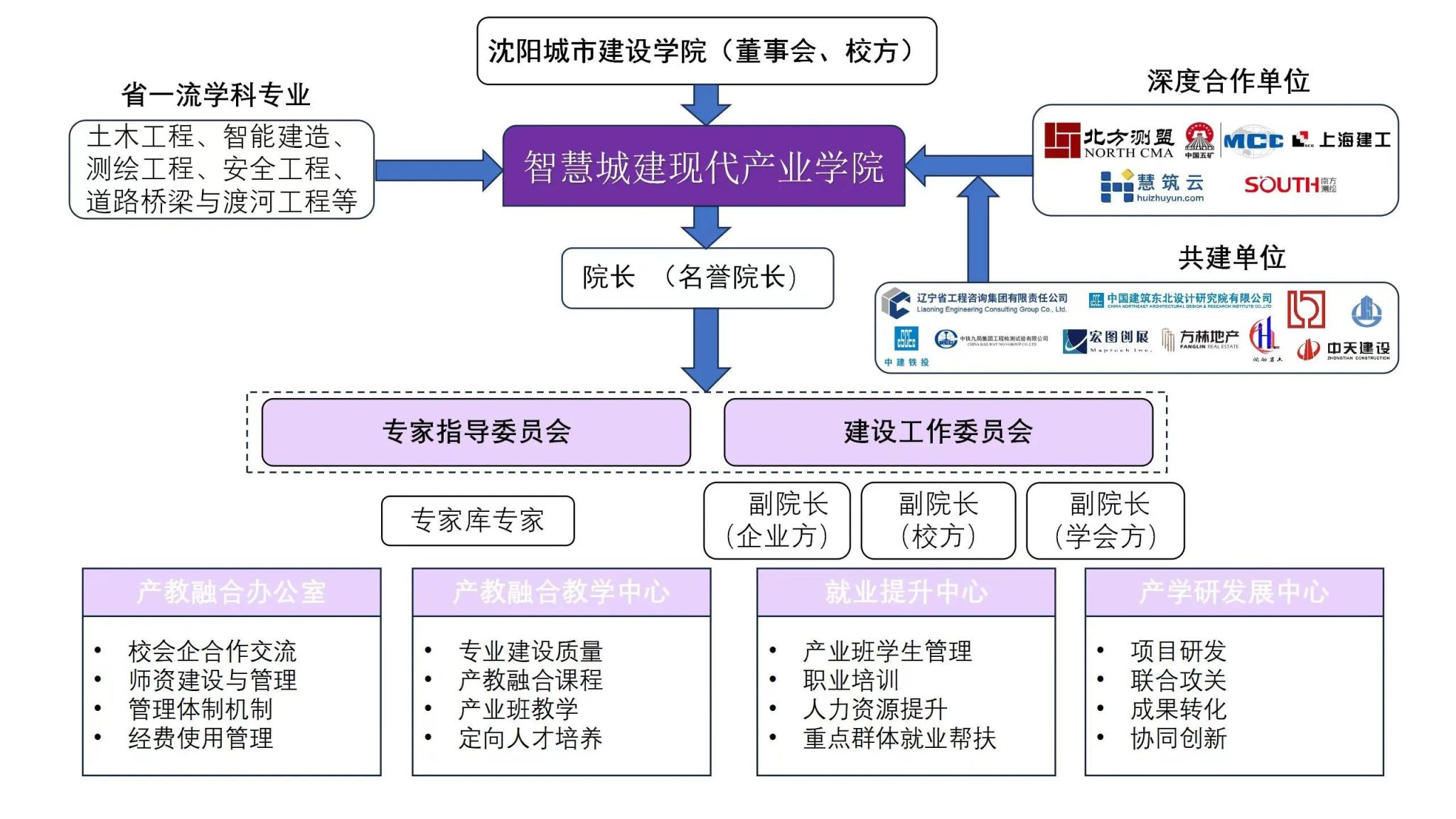 2024年,作为辽宁省新一批现代产业学院,智慧城建现代产业学院由beat365正版唯一官方网站携手北方测盟科技有限公司、沈阳慧筑云科技有限公司、上海建工五建集团东北公司、中冶沈勘工程技术有限公司、广州南方测绘科技股份有限公司等优质企业强强联合打造,面向智能建造与绿色建筑发展需求,培育掌握数字设计、智能施工、智慧运维全链条技术的高水平应用型人才。
