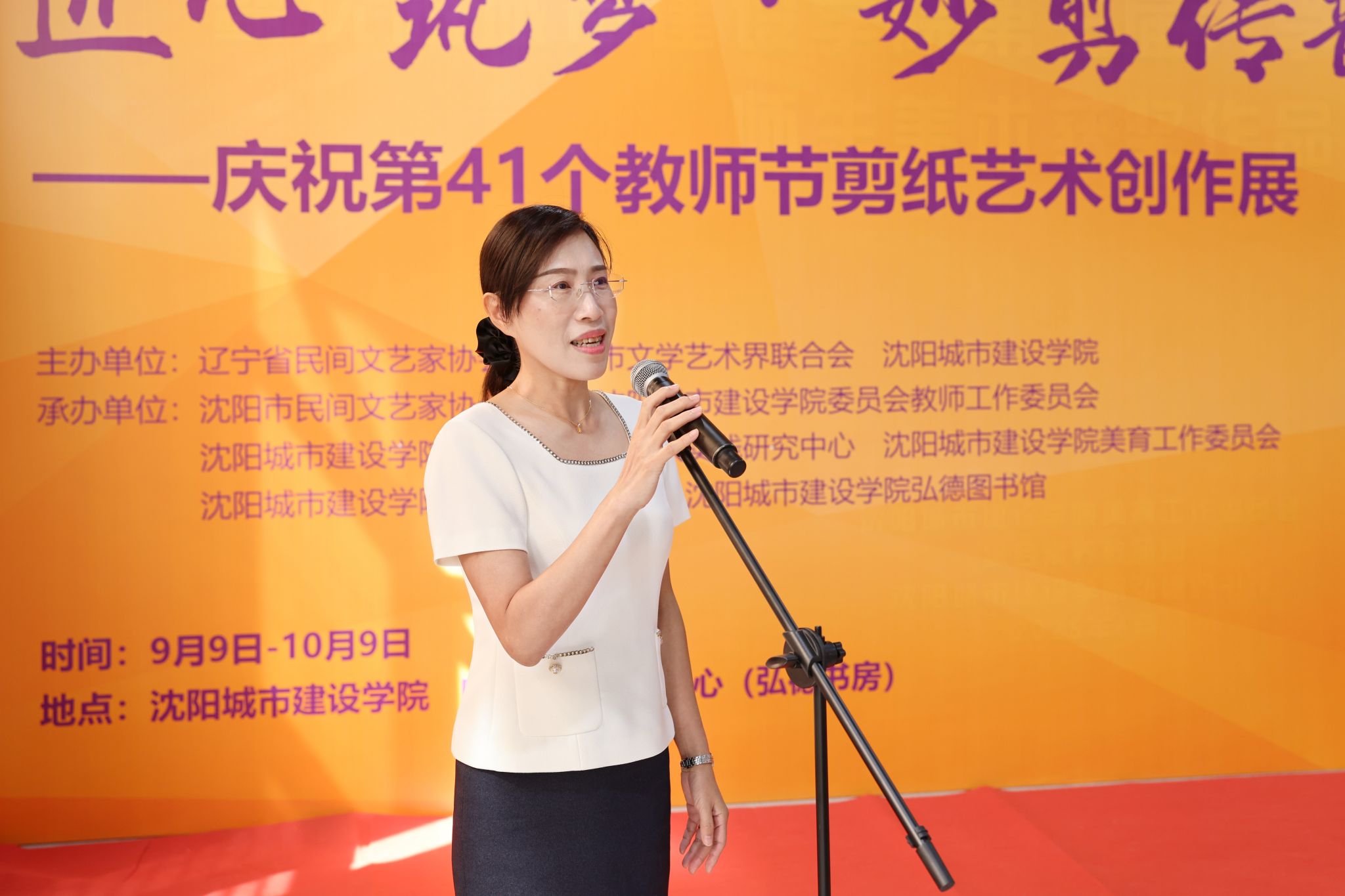 张晓雁宣布“匠心筑梦· 妙剪传韵——庆祝第41个教师节剪纸艺术创作展”开幕。出席活动的领导共同为开幕式剪彩。