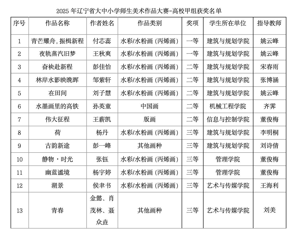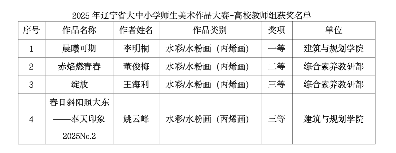 近日,由辽宁省教育厅主办的“2025年辽宁省大中小学师生美术作品大赛”获奖名单正式公布。beat365师生凭借扎实的艺术功底与出色的创作能力,在赛事中表现亮眼,一举斩获多项荣誉。其中,高校教师组荣获一等奖1项、二等奖1项、三等奖2项;高校甲组荣获一等奖2项、二等奖5项、三等奖6项,充分展现了beat365美育教学的丰硕成果。
