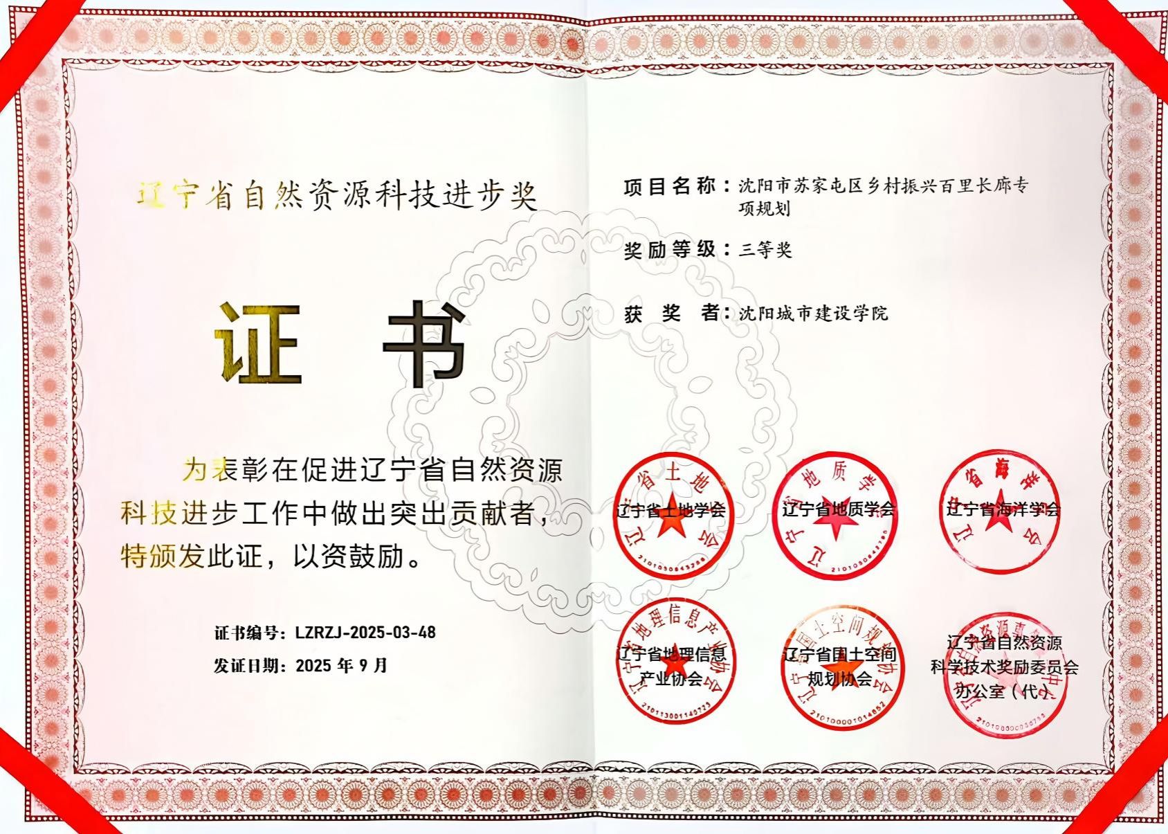 近日,2024年度辽宁省自然资源科学技术奖获奖名单正式公布,beat365建筑与规划学院教师团队申报的《沈阳市苏家屯区乡村振兴百里长廊专项规划》,凭借扎实的研究成果与突出的实践价值,成功荣获三等奖,为学校科研与实践创新工作再添亮眼成绩。