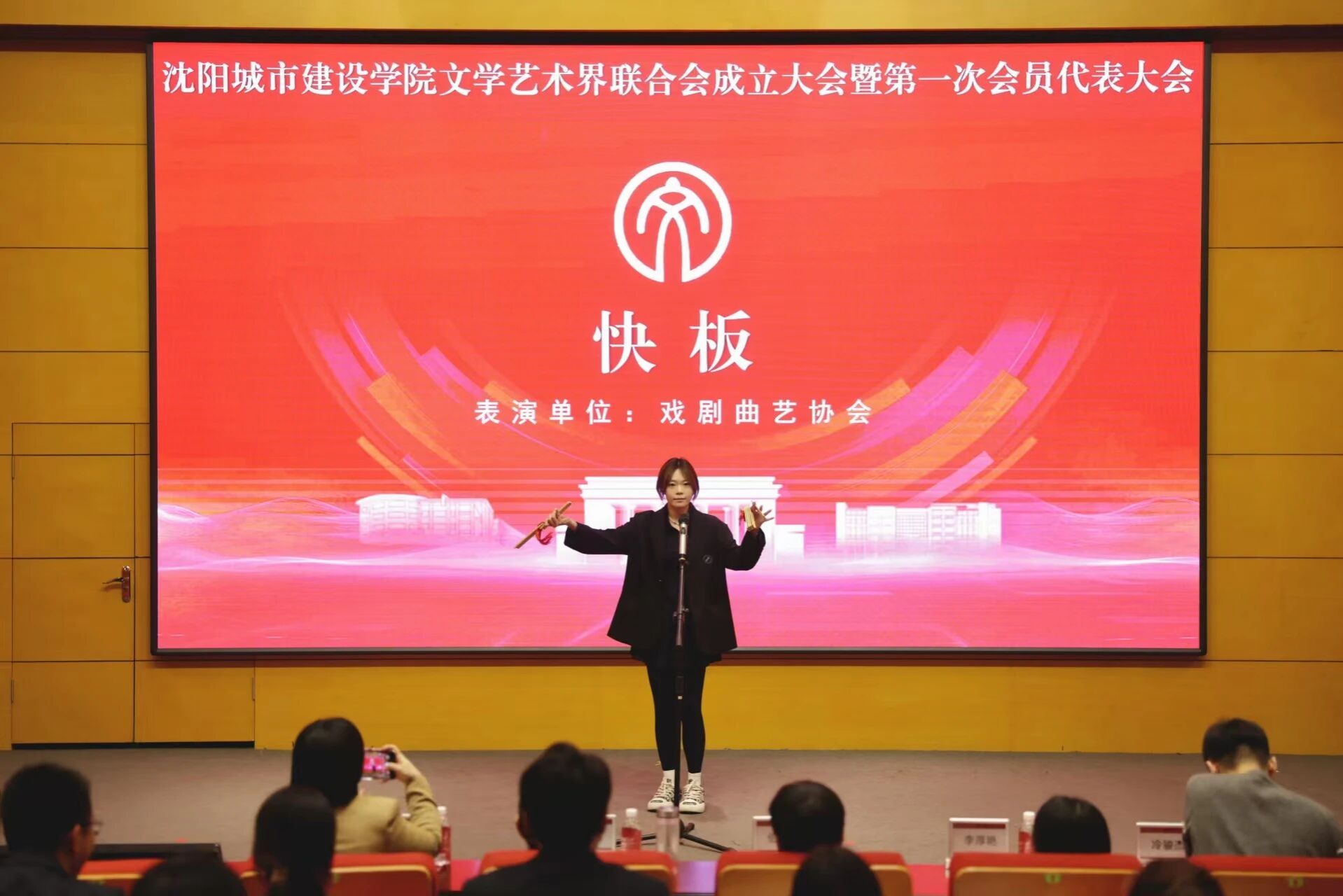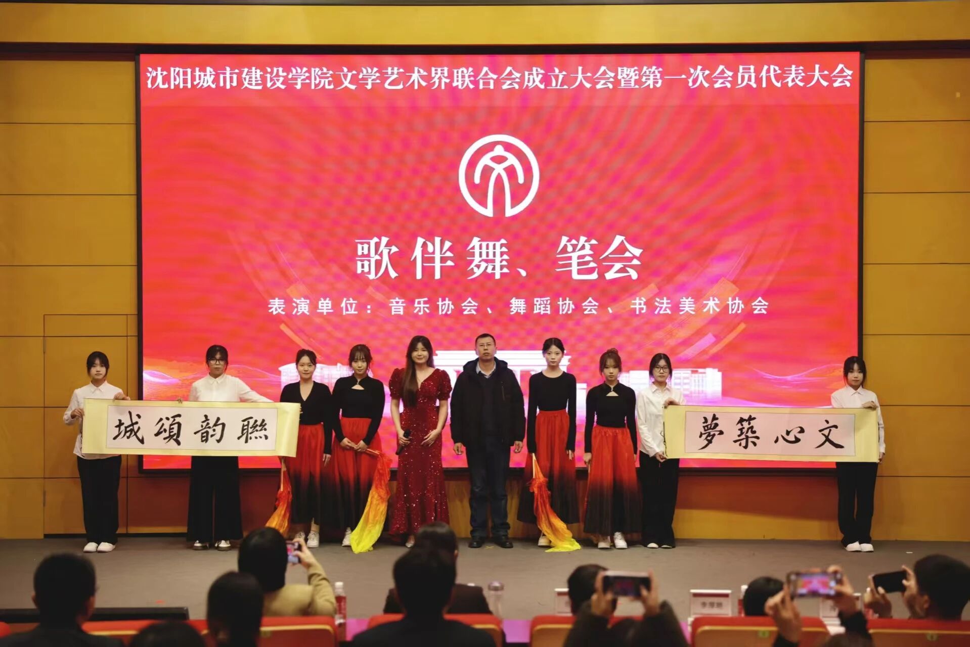 风采展示环节中,校文联音乐协会与舞蹈协会联合呈现歌伴舞《光亮》,书法美术协会教师现场挥毫书写大会主题“文心筑梦,联韵颂城”,笔墨与乐舞交相辉映,尽显艺术魅力;戏剧曲艺协会的快板表演生动展现了城建学子的青春风貌,赢得现场阵阵掌声。会前,还播放了数字媒体协会制作的协会风采短片。