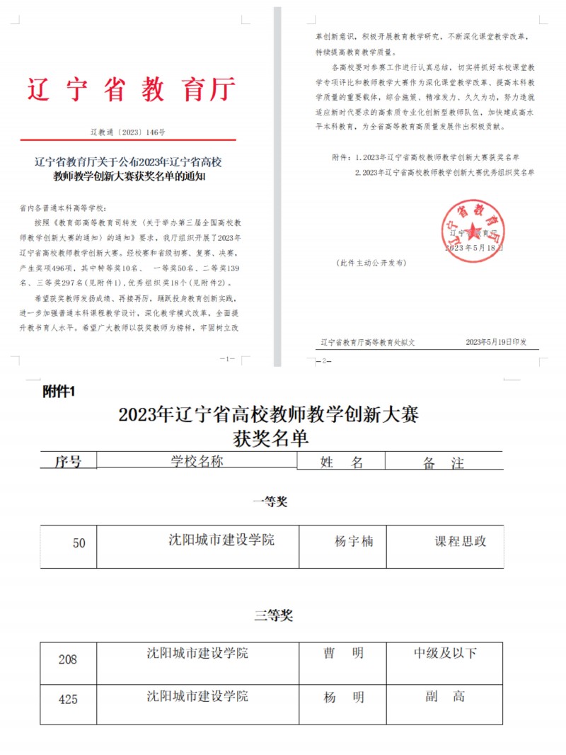 近日,辽宁省教育厅公布了2023年辽宁省高校教师教学创新大赛获奖名单,beat365建筑与规划学院杨宇楠教师团队(吉燕宁、郝燕泥、姜岩)荣获课程思政组一等奖;信息与控制工程学院杨明、市政与环境工程学院曹明均获三等奖。这是beat365参加此项大赛以来取得的最好成绩,实现了新的突破。