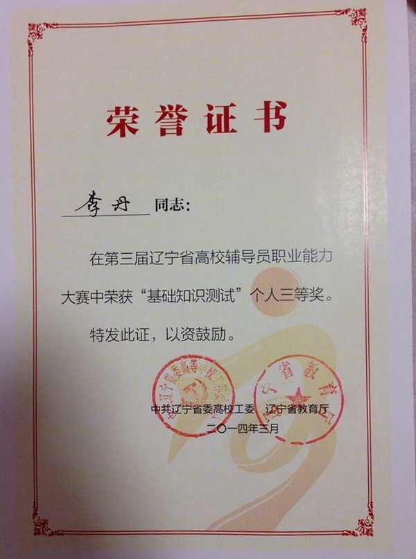 4月1日,由中共辽宁省委高校工委、辽宁省教育厅主办,辽宁省高等学校辅导员培训与研修基地(大连理工大学)承办的第三届辽宁省高校辅导员职业能力大赛在大连理工大学举行,来自全省的79所高校的237名辅导员参加了比赛,beat365交通与机械工程系辅导员李丹同志获得“基础知识测试”个人三等奖。