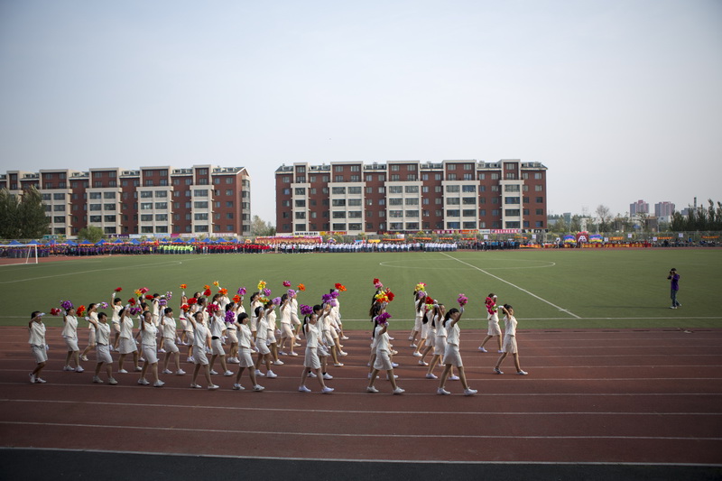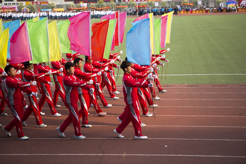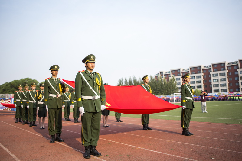 鲜艳的五星红旗冉冉升起,朝气的青年学生奋斗赛场
