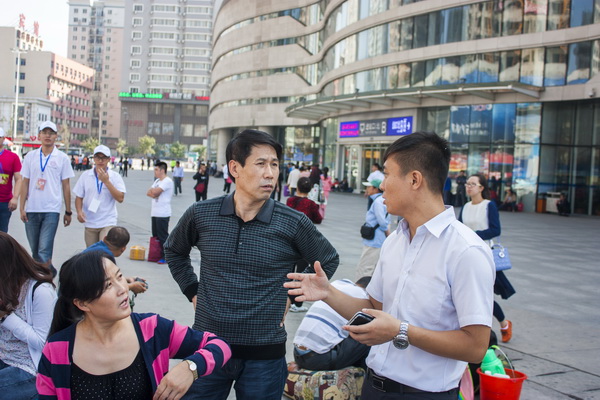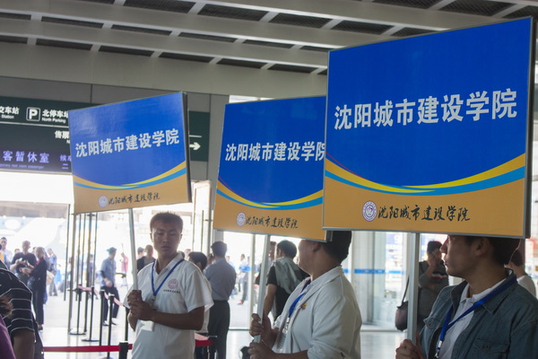 在沈阳北站和沈阳站,迎新志愿者高举学校名牌,在出站口引导。针对火车站出口较多的情况,志愿者进行了明确分工,各负责一区,确保无一遗漏。