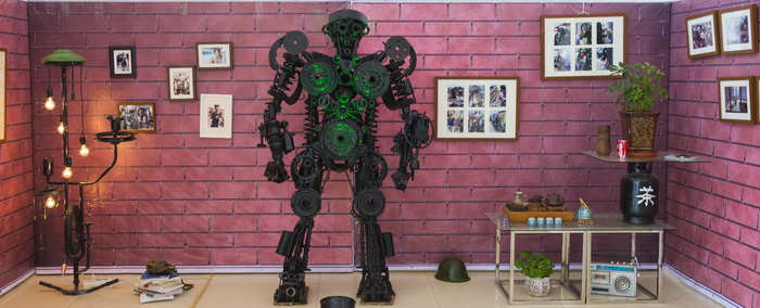 5月20日,由建筑与艺术系学生冯炜设计和主创的铁艺设计作品展在教学楼正厅举行。本次展出的作品共有三件,分别为“机器人·海夫”,“台灯·戈多”和“茶台·时代”。