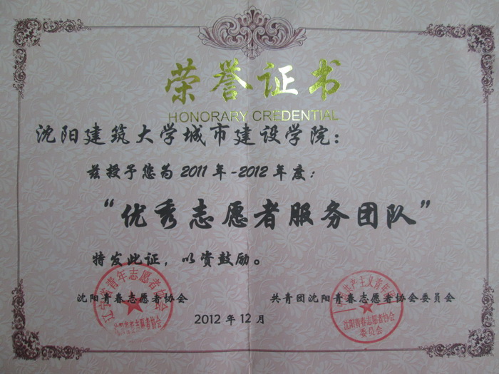 近日,由沈阳市青春志愿者协会举办的2011-2012年度“优秀志愿者服务团队”表彰活动落下帷幕,学院与沈阳理工大学等四所高校获得“优秀志愿者服务团队”荣誉称号,土木系学生邵聪获得第十二届全运会沈阳赛区“优秀志愿者”称号。