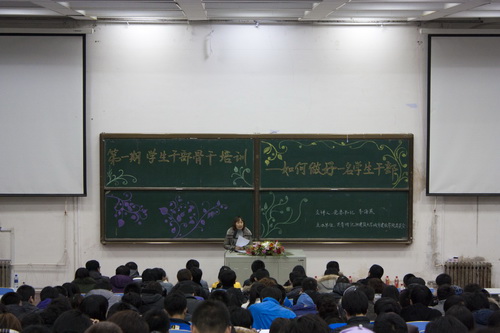 为贯彻落实团中央关于《“青年马克思主义者培养工程”实施纲要》,进一步加强我院学生干部队伍建设,11月24日,由团委主办的学生干部骨干培训班第一期专题讲座在礼堂隆重举行。本次讲座邀请学院党委书记李海燕为全院学生干部做了题为《如何做一名合格的学生干部》的专题报告。学生处、团委负责人,部分系副主任、分团委书记、辅导员和全院学生干部500余人参加了此次培训。
