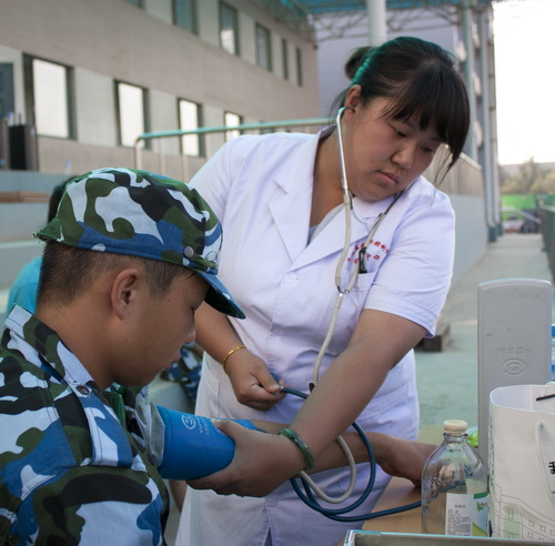 茵茵训练场上离不开白衣天使的细心照料