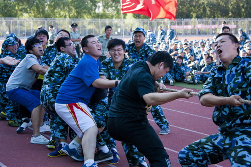 训练中不仅有严苛的军姿,也有拔河的快乐