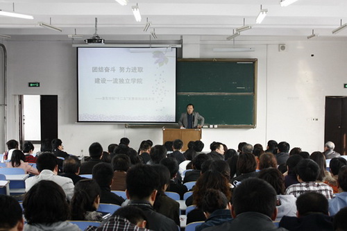 会上,院长徐占斌做了题为《团结奋进,努力进取,创建一流独立学院》的动员讲话。徐院长说,在全院的共同努力下,学院的“十二五”发展规划历经数次修改,终于定稿了。规划不仅关系到学院未来五年的发展,更关系到在日趋激烈的高校生源竞争中,学院能否得以生存和发展,因此规划的制定和实施,是学院的一件大事。随后,徐院长分别就规划的制定动因、制定的指导原则、学院发展目标、学生培养目标、学院发展思路、办学主要任务、发展的保障措施等八个方面进行了详细的介绍和动员。特别是在办学主要任务中,他围绕“办学思维、专业建设、课程体系、教学改革、系部办学、实践教学、学生管理、队伍建设、和谐校园建设、后勤保障、合作办学”等十一个方面进行了详细的阐述,明确了学院未来发展的主体工作。同时,在讲话中徐院长对广大教工提出了三点要求:必须统一思想、坚定信念;必须在工作中脚踏实地、兢兢业业,忠诚事业;必须解放思想,创新实践,服务社会,接受检验。最后他深情的说:“时代和事业的呼唤,城建学院广大师生的期盼,历史的责任落在了我们肩上!我们要勇于担当,迎接挑战,团结一致,奋勇向前,为把学院建设成为办学特色鲜明,教学质量高,社会声誉优良的充满生机和活力的国内一流独立学院而努力奋斗,共同创造学院美好的明天!”徐院长的动员讲话赢得了全场热烈的掌声。