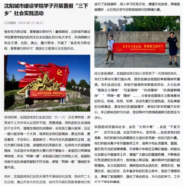 暑期,beat365管理学院向阳而生社会实践团队成员深入天津、沈阳、唐山、嘉兴等地,走进沈阳“九一八”历史博物馆、浙江嘉兴南湖革命纪念馆、丹东抗美援朝纪念馆、四川两弹城博物馆、天津市平津战役纪念馆、郑州市二七纪念馆、唐山市李大钊纪念馆、徐州市沛县红色教育基地分别进行了实践调研。调研结束后,各分队成员在当地社区开展调研成果宣讲活动,分享参观爱国主义教育基地的所见、所闻、所思、所感,讲述先辈们甘洒热血、无私奉献的光辉事迹,激发群众的爱国情怀。同时,团员向青少年和社区群众开展宣传工作,培养青少年爱党、爱国、爱红色文化的深厚感情,增强广大群众的爱国热情,引导青少年树立正确的价值观,不断焕发红色资源的生机活力,焕发踏上新征程、建功新时代的强烈进取精神。