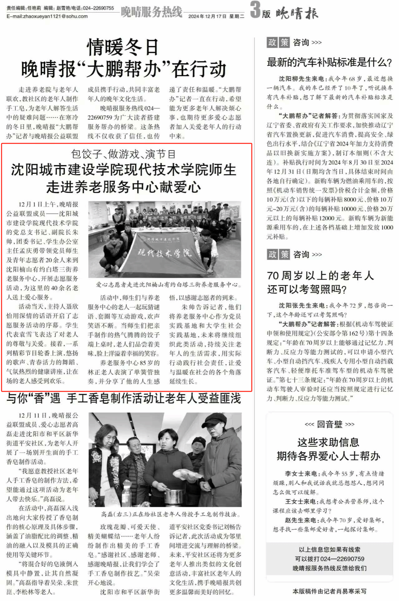 12月17日,晚晴报3版以《beat365正版唯一官方网站现代技术学院师生走进养老服务中心献爱心》为题,深入报道了beat365师生参与暖心志愿服务活动的事迹。报道对beat365长期致力于培养学生社会责任感和奉献精神的教育实践给予了高度评价。