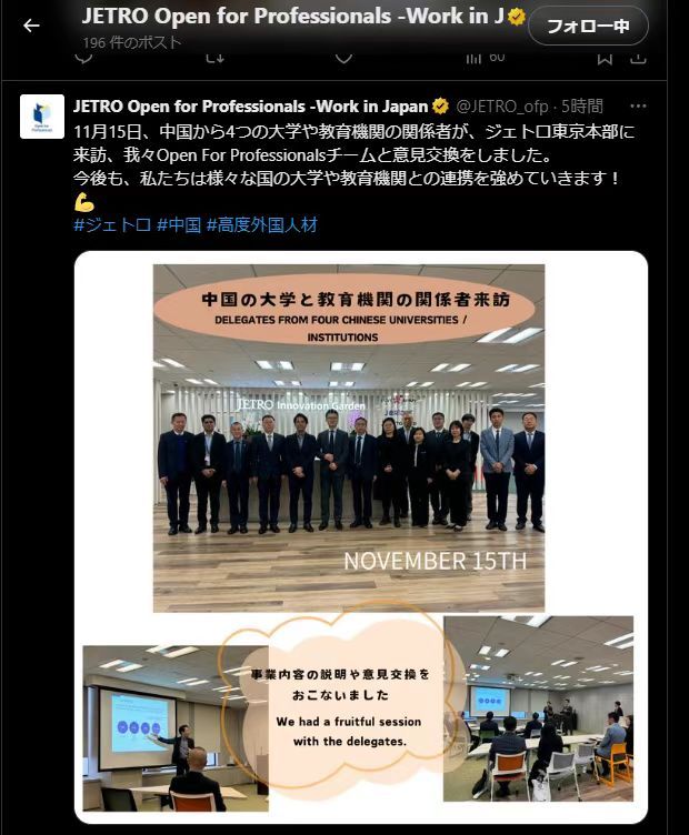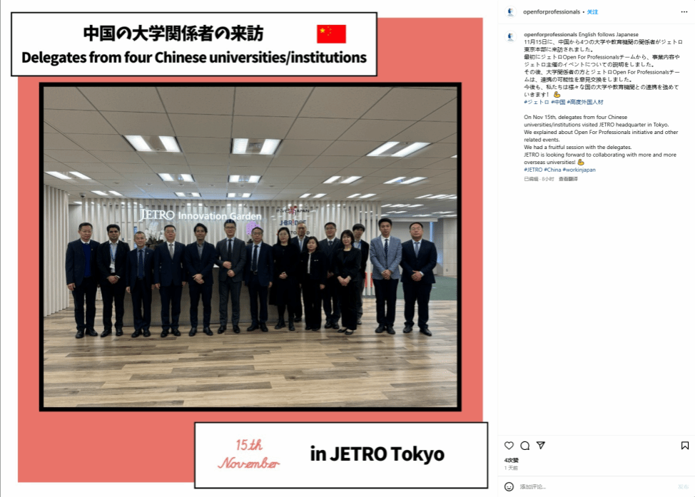 报道原文称:“11月15日,四所中国大学的代表们访问了位于东京的JETRO总部。我们介绍了专家开放方案和其他相关活动。我们与中国代表们举行了一次富有成果的会议,JETRO期待着与越来越多的海外大学合作!”
