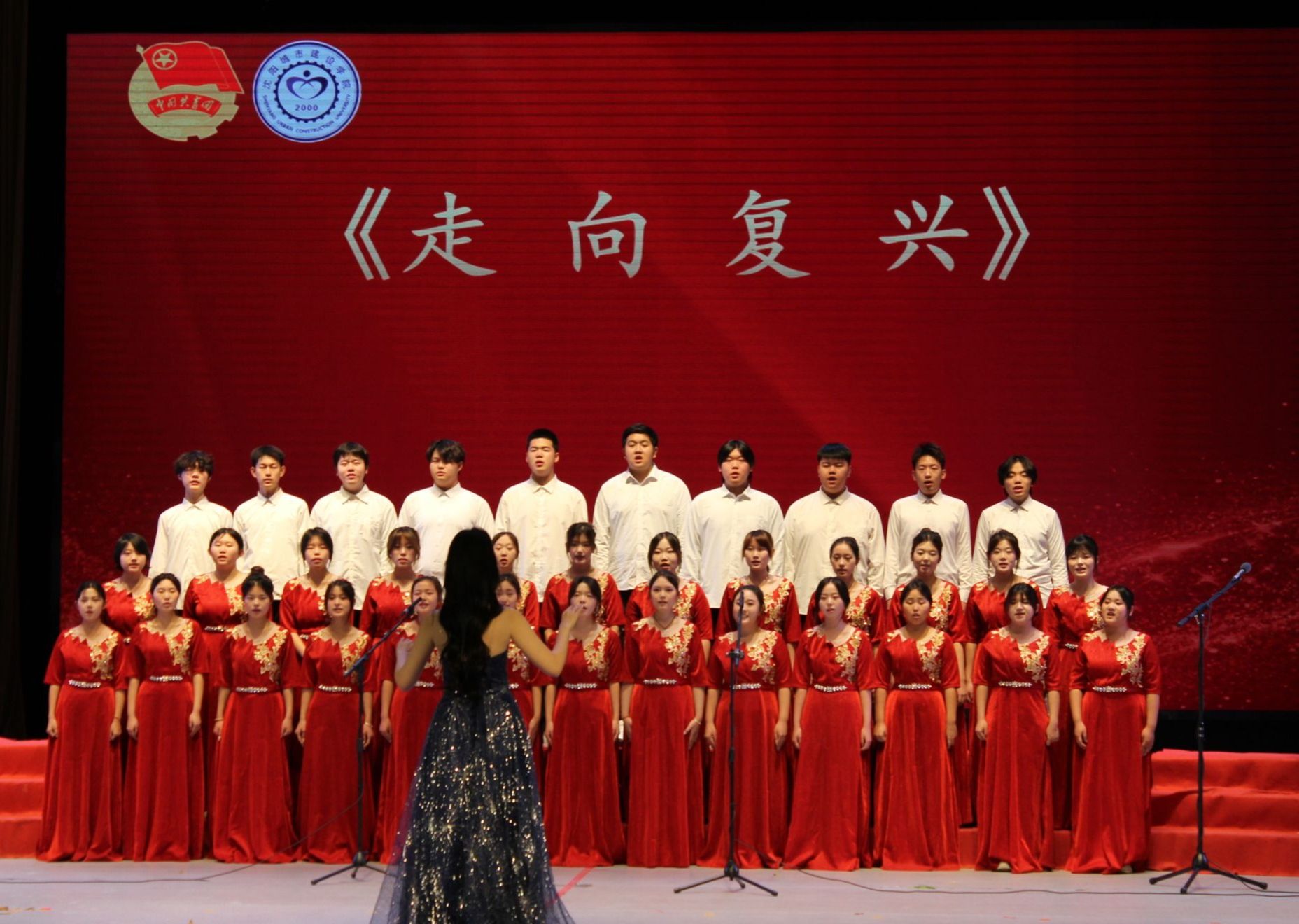 第二篇章“光辉征程·时代颂歌”以《灯火里的中国》《走向复兴》为核心主线,女子合唱《映山红》的真挚演绎,将红色文化的深厚底蕴与爱国主义的炽热情怀融入艺术表达,传递出奋进征程中的责任与担当。演出期间,还特别播放了学校在辽宁省首届国际大学生合唱艺术展演中斩获佳绩的小合唱作品《篇章》《祖国不会忘记》,生动展现了学校以实践育人为导向的文化育人成效。