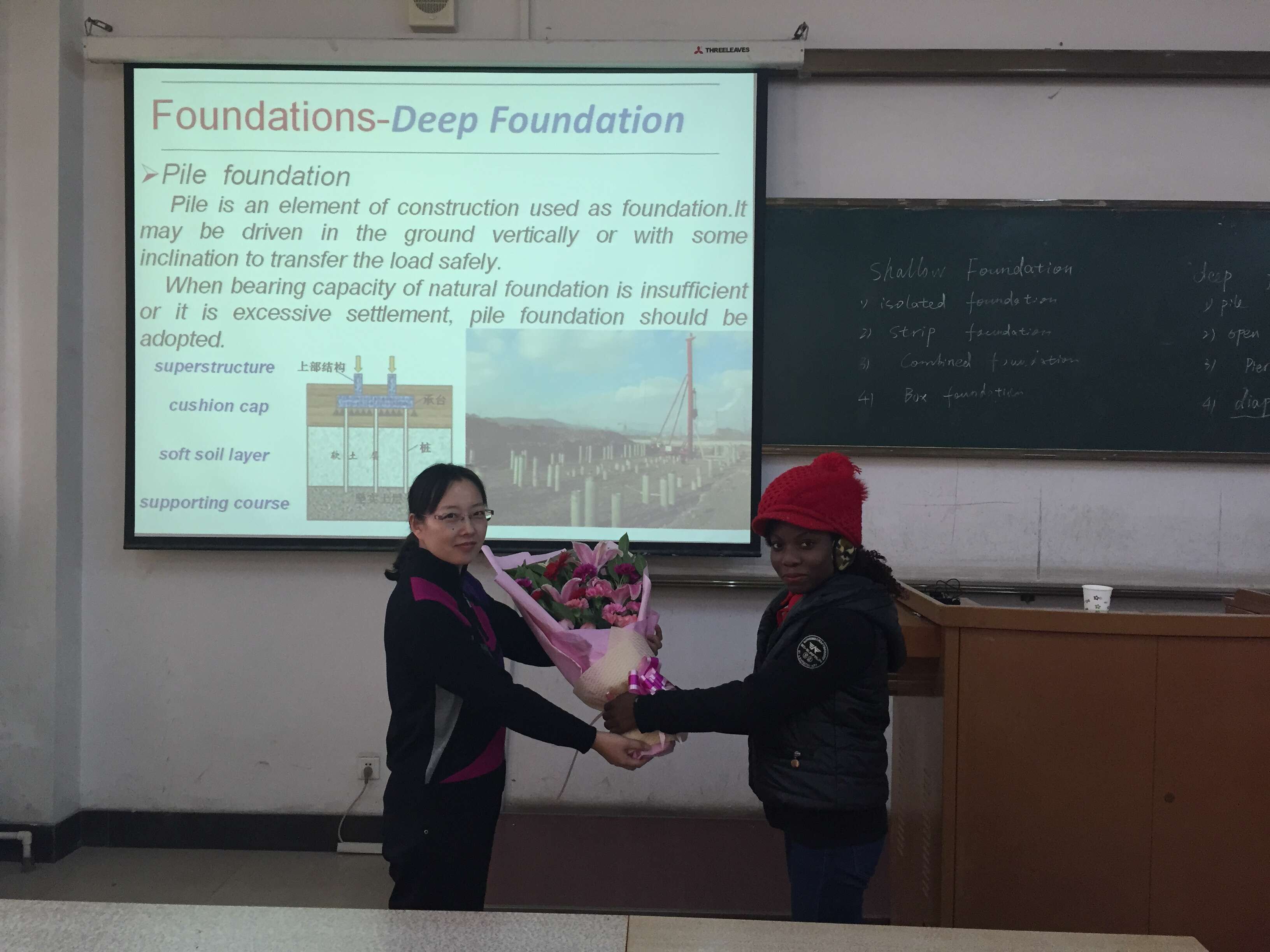 通过一个学期的课程学习,留学生们较好地掌握了土木工程专业相关的理论知识,对自己的专业也有了更深刻的领悟。课程结束后留学生们纷纷表示了对任课老师宋锦的惜别之情,学生代表也为宋锦老师送上鲜花以表达对老师的感谢。