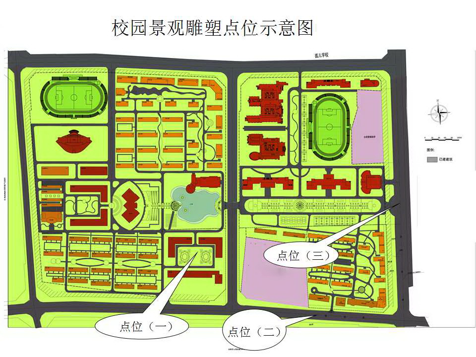 (一)北校区教学楼间广场绿地。 (主题内容能体现校园文化特色的标志性雕塑)
