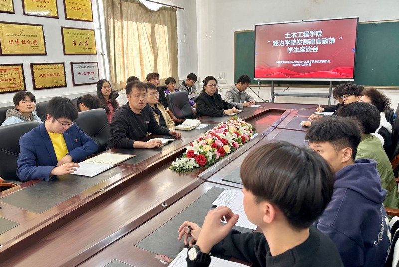 为扎实推进学习贯彻习近平新时代中国特色社会主义思想主题教育走深走实,激励和引导学院学子以更好的精神面貌和热情投身学习生活,发扬主人翁精神,共谋学院发展,10月26日,土木工程学院在出新楼305会议室召开“我为学院发展建言献策”学生座谈会,会议由党总支书记、副院长钟建东主持,副院长于明鑫、学生党支部书记、辅导员代表、学生党员代表、2023级新生代表参加座谈。