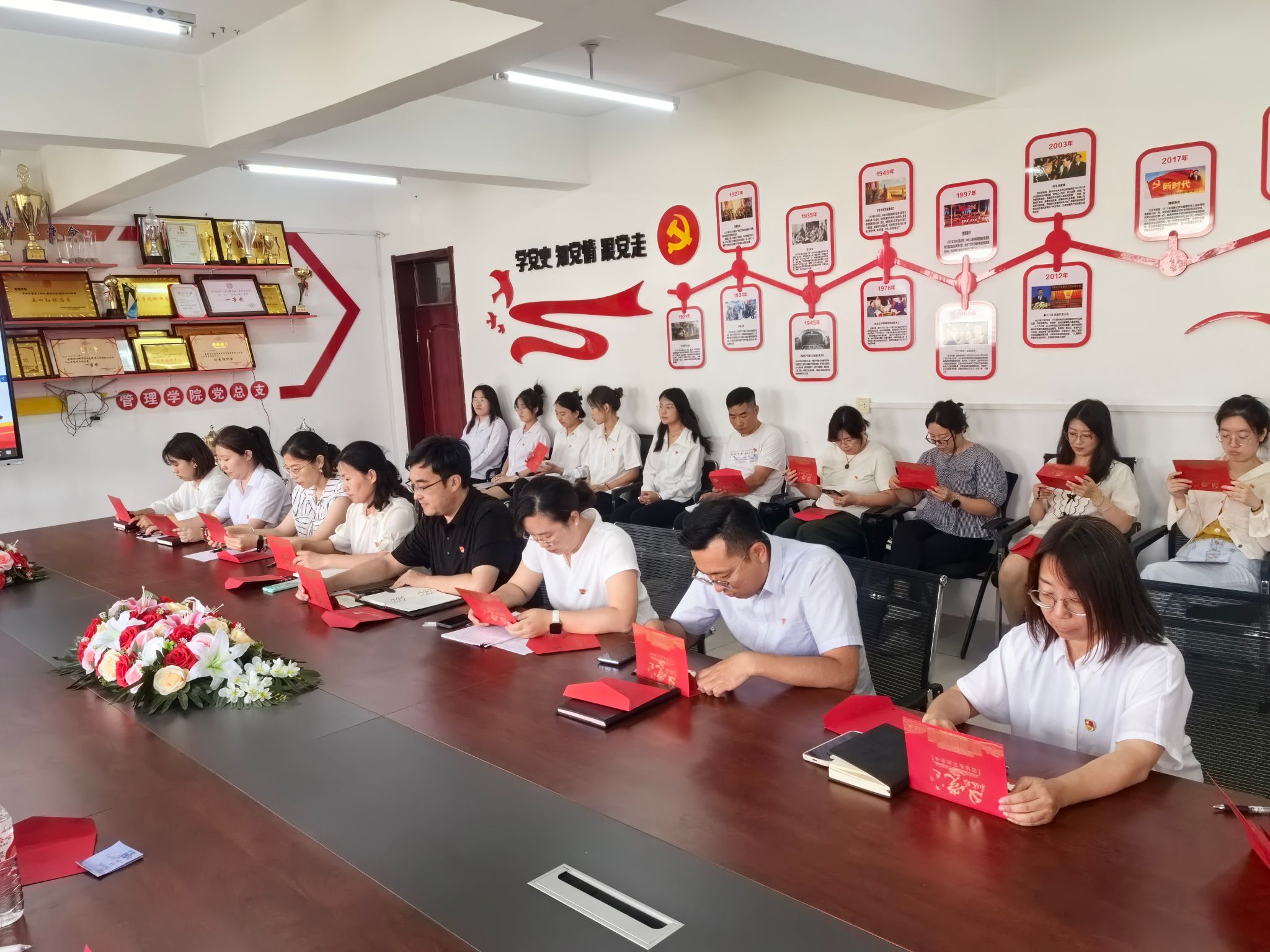 为庆祝中国共产党成立103周年,近日,管理学院党总支在出新楼412室举办“不忘初心勇攻坚,奋楫扬帆启新程”集体政治生日会。管理学院党总支书记鲍宇、院长刘阳及部分师生党员参加活动。