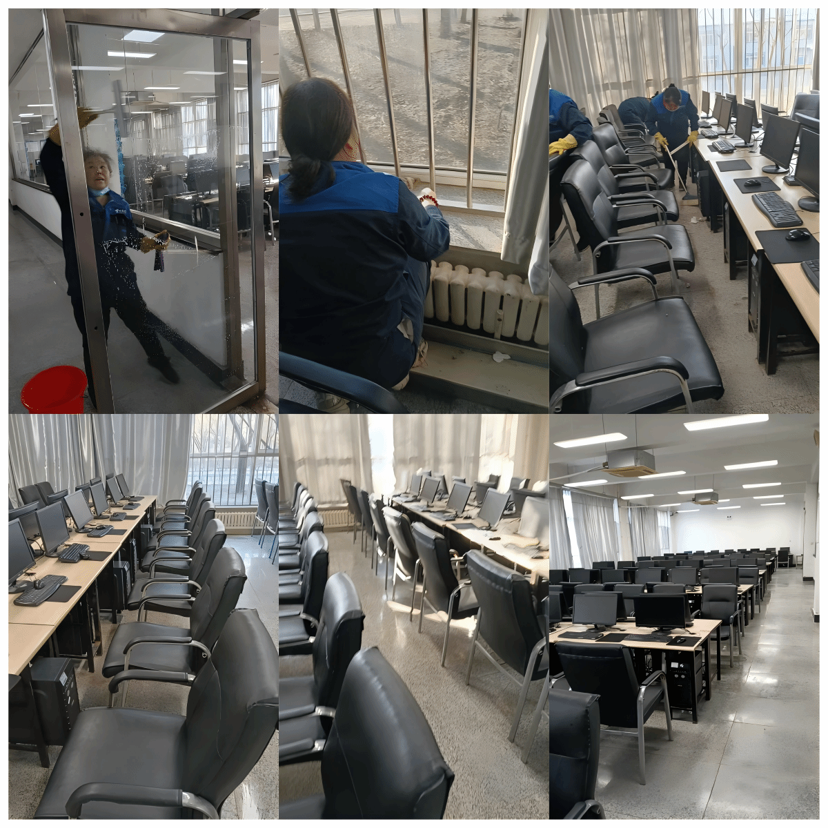 活动开始前,各党支部成员及相关部门负责人共同商讨活动方案,明确责任分工。后勤集团直属党支部委派保洁人员积极对学校公共教学机房和语音教室进行细致的打扫。他们不仅对地面、墙面、天花板等公共区域进行了彻底清扫,还对机房内的电脑设备、桌椅板凳进行了细致擦拭,确保每一处角落都焕然一新。同时,图书信息直属党支部和通识教育党总支的成员也积极参与到活动中来,他们协助清洁团队进行设备检查与维护,确保所有教学设施都能正常运行。