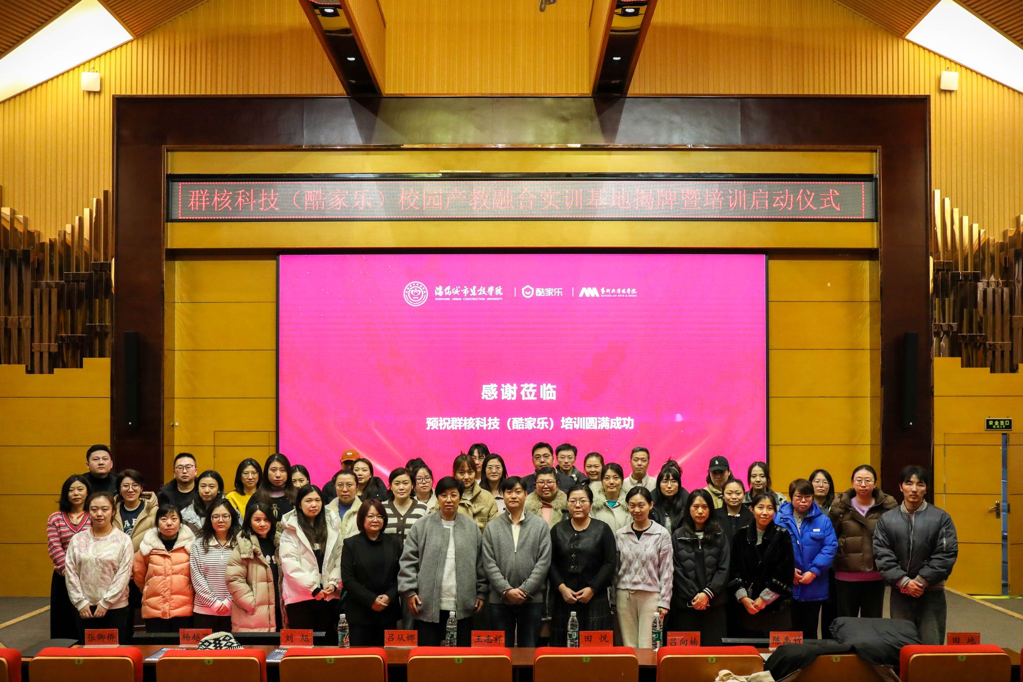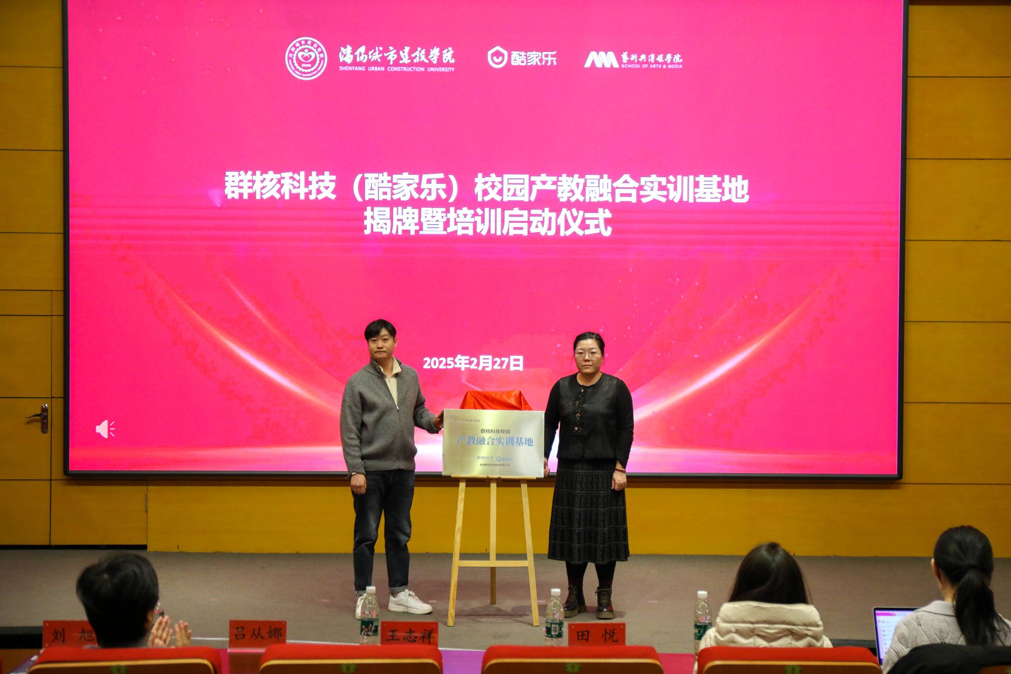2月27日,艺术与传媒学院在留学生院 306学术报告厅举行群核科技(酷家乐)共建校园产教融合实训基地揭牌暨培训启动仪式。本次活动旨在深化校企合作,丰富本院数字化教育教学资源,为学生搭建实践创新平台推动艺术设计教育与泛家居行业的深度融合群核科技(酷家乐)教育事业部华北大区负责人王志祥、学校教务处处长田悦艺术与传媒学院院长吕从娜,党总支书记、副院长吕向楠和各教研室主任专任教师21级毕业生代表出席仪式。仪式由艺术与传媒学院副院长刘旭主持