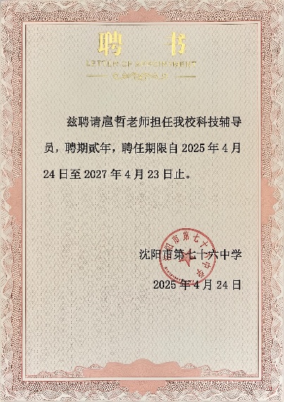 为深入贯彻落实教育部等十八个部门《关于加强新时代中小学科学教育工作的意见》,积极响应沈阳市“科技助苗行动”的号召,沈阳城市建设展示馆与沈阳市第十七中学、沈阳市第七十六中学、沈阳市第九十五中学以及沈阳市文艺二校沈北分校建立结对共建关系,共同推进科普“双进”工作。近日,沈阳城市建设展示馆馆长吉燕宁、馆员扈哲分别被沈阳市第七十六中学聘为科学副校长和科技辅导员,副馆长罗健(罗云天)被沈阳市第十七中学聘为科学副校长,标志着馆校合作迈入新阶段。