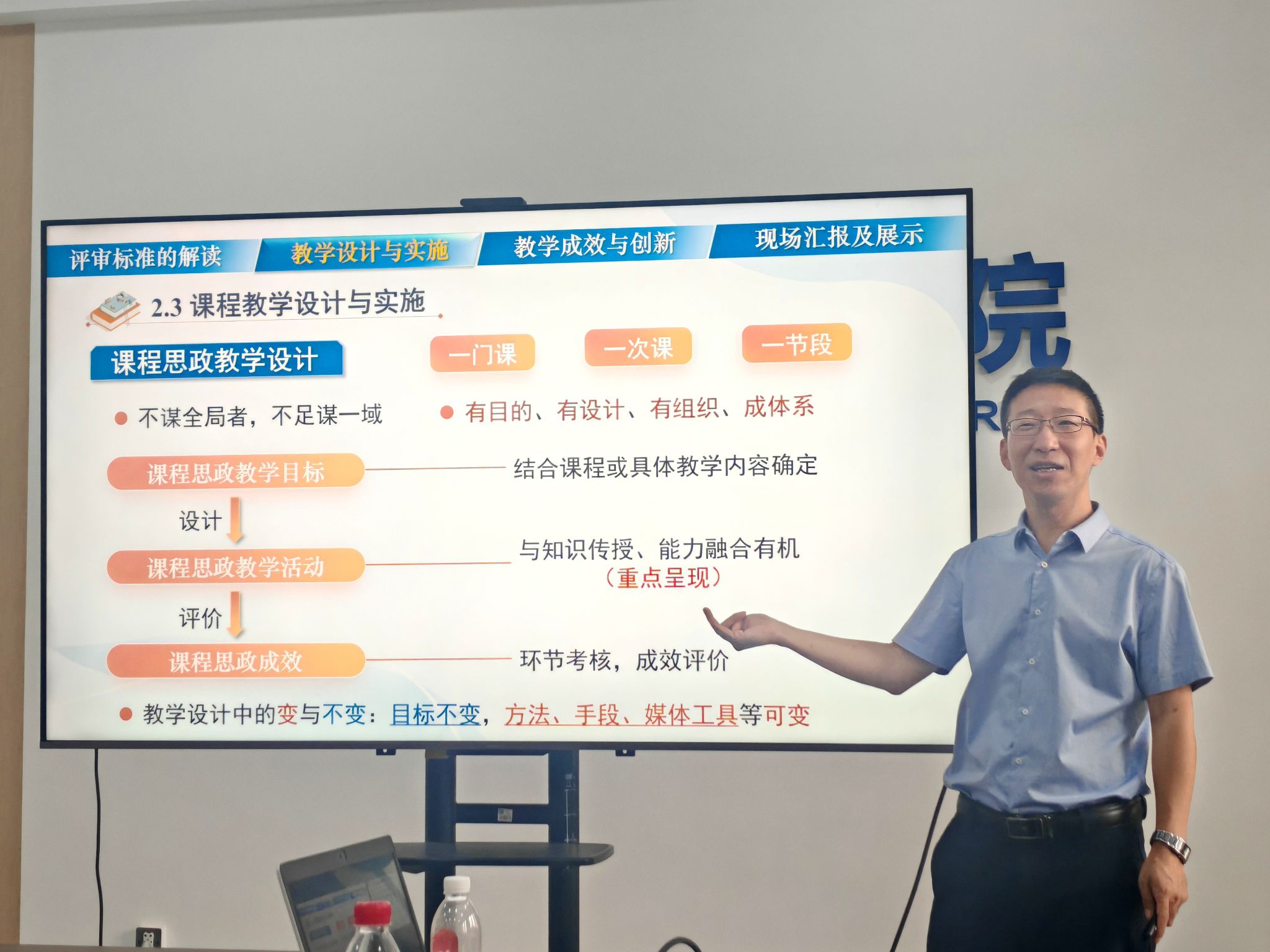 在“教学设计与实施”部分,谢正义以其主讲的《流体力学与液压传动》课程为例,重点阐述了课程思政的“三结合”与“两融入”的创新实践路径,强调了“以学生发展为中心”的教学理念,并介绍了“三师联动”协同育人的有效机制。