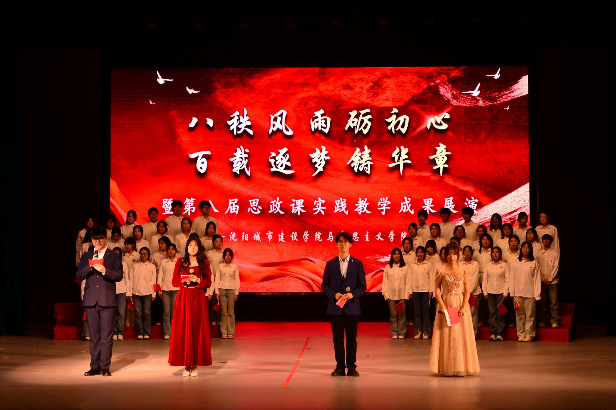 在纪念中国人民抗日战争暨世界反法西斯战争胜利80周年的重要节点,为深入学习贯彻党的二十大和二十届历次全会精神,12月4日,马克思主义学院在音乐厅举办第八届思政课实践教学成果展演。本次展演以“八秩风雨砺初心百载逐梦铸华章”为主题,创新融合实践教学、历史纪念与艺术展演,为500余名师生呈现了一堂立意深远、形式生动的场馆思政大课。
