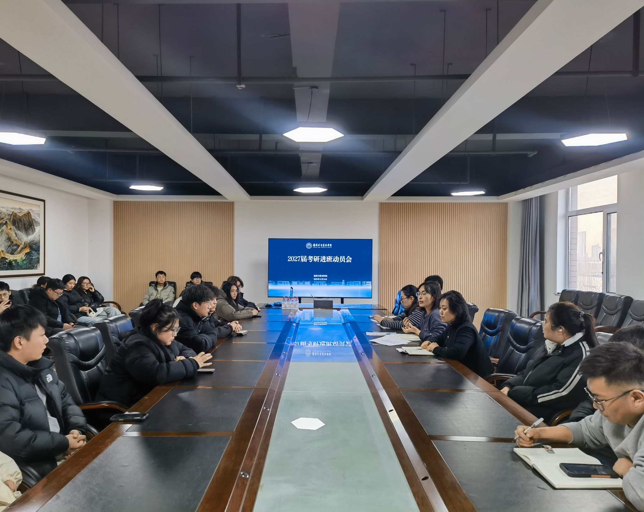 近日,建筑与规划学院在创新楼506教室召开2027届考研进班动员会。党总支书记、副院长牛艺,副院长葛述苹,建筑学教研室主任张一帅,升学辅导员及班导师共同参会,与2027届校内辅导班学生展开面对面深度交流,为同学们的考研备考之路提供精准导航。