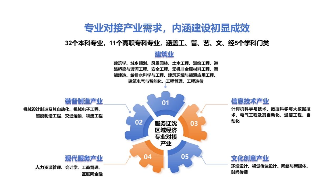 学校现有32个本科专业,11个高职专科专业,以专业对接产业,面向建筑业、装备制造业、信息技术产业、现代服务业、文化创意产业等产业,不断优化学科专业结构布局。实行“调、停、转、增”的动态专业调整机制,第一次党代会以来结合社会需求,新增本科专业9个,专科专业5个;撤销本科专业1个,专科专业1个;停招本科专业3个。学校有辽宁省一流本科教育示范专业2个;辽宁省向应用型转变试点专业1个;辽宁省创新创业改革试点专业1个;校级优势特色专业3个,特色专业7个,德国ASIIN专业认证专业6个,以省一流本科教育示范专业建设为突破点,以德国ASIIN专业认证为抓手,全面推进全校所有本科专业升级改造。