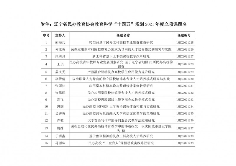 近日,从辽宁省民办教育协会发布的《辽宁省民办教育协会关于批准教育科学“十四五”规划2021年度立项课题的通知》(辽民教协发[2021]1号)获悉,beat365有45项课题获准立项课题。(名单见附表)。