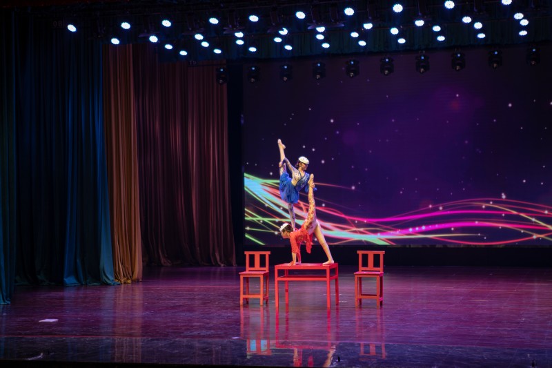 男生二重奏唱《星辰大海》、《美丽中国走起来》将音乐会推上了高潮,台下观众跟着齐声合唱,学生和演员频繁互动。杂技《牵丝戏》、《心手相依》,震撼人心的双人组合,将技巧与力量的艺术之美淋漓展现,绝佳的默契与配合,扎实的功底和技巧,惊险又刺激,精彩的杂技表演令人叹为观止。