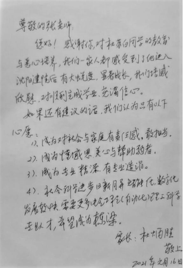 信息与控制工程系线上家访期间,辅导员向家长详细的介绍了学校的学分管理制度、学业预警制度和学生目前的学业状况,与特殊群体学生的家庭情况进行了沟通和交流,让学生和家长感受到学校的关怀。在对大四学生进行家访时,辅导员对实习就业情况进行了讲解与分析,使得学生和学生家长能够认识目前就业形势,积极寻找就业机会,共同努力帮助学生顺利就业。学生家长非常支持家访工作,纷纷表示感受到了学生在入学后的成长和蜕变,愿意与学校共同做好学生的成长教育。有的家长还撰写了感谢信以此表达对学校和老师的感谢之情。