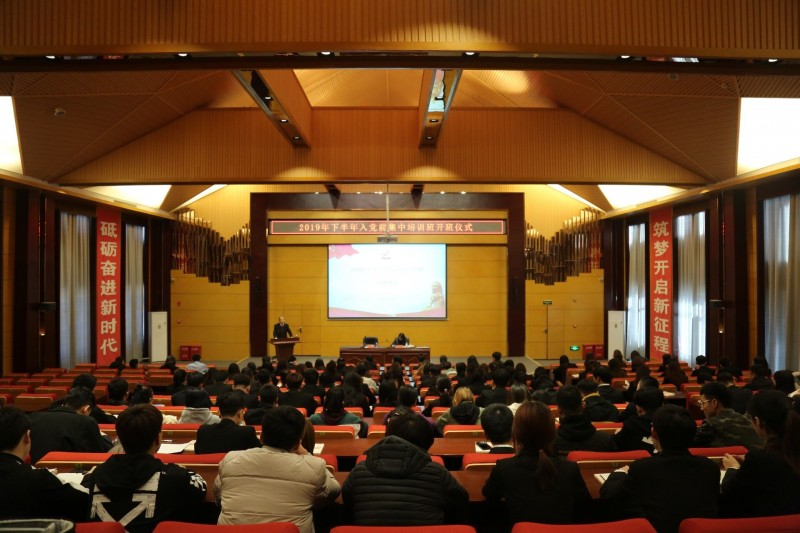 在开班仪式上,党委书记崔景懿作了动员讲话。他指出,今年是中华人民共和国成立70周年,在中国共产党的带领下,全国各族人民团结一致、奋发有为取得了巨大的成就。当前正是开展第二批“不忘初心、牢记使命”主题教育之时,又逢党的十九届四中全会召开之际,在此结点举办开班仪式具有特殊的意义。他强调,全体学员要坚定理想信念,加强政治学习,提高政治修养,提升政治觉悟,努力作一名担当民族复兴大任的时代新人。他向全体学员提出三点要求:一是要端正入党动机,不断修正思想上的认识,解决思想上入党的问题;二是要坚持学习马克思主义科学理论,认真贯彻落实习近平新时代中国特色社会主义思想,读原著、学原文、悟原理,用理论武装头脑;三是要认真对照党章党规,不断完善自己的言行,按照合格党员的标准要求自己,在学习、工作之中不断锤炼忠诚、干净、担当的品质,增强“四个意识”、坚定“四个自信”、做好“两个维护”,为学校的建设发展,为社会的进步,为国家的繁荣,为民族的振兴贡献自己的力量。