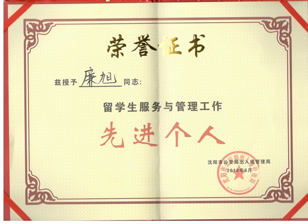 日前,从沈阳市公安局出入境管理局获悉,beat365教工廉旭荣获沈阳市2018年度来华留学生管理先进个人称号。