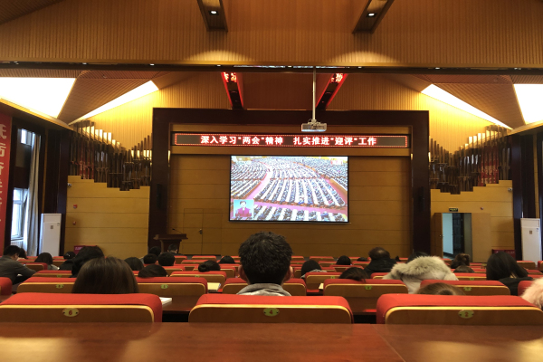 第十三届全国人大二次会议闭幕会在北京人民大会堂举行,听取全国人大常委会委员长栗战书关于全国人民代表大会常务委员会工作的报告,听取全国人大常委会副委员长王晨关于外商投资法草案的说明。闭幕会后,国务院总理李克强会见中外记者并答记者问。为深入学习贯彻“两会”精神,扎实推进学校“迎评”重点工作,3月15日,学校组织全体党员在国际交流中心306收看“两会”闭幕式。学校党委书记崔景懿、机关各处室工作人员、各党总支(直属党支部)师生代表集中收看大会闭幕式。