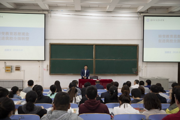 温景文围绕“高等教育发展的历史需要大学转型、国际社会转型需要大学转型”两个方面阐述了学校转型的背景和意义。中西方高等教育理念的变迁,当前科学技术的发展,产业转型升级,网络信息社会的发展都对高校的转型提出了具体要求,国家和辽宁省也出台了一系列政策推动高校转型。