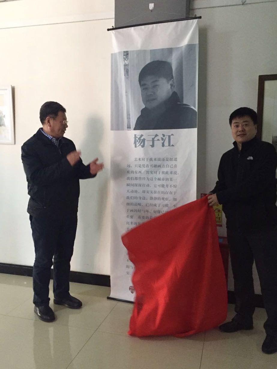 图片3:校长王军与学会委员、画家杨子江为画展揭幕