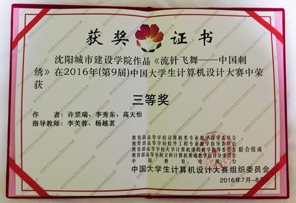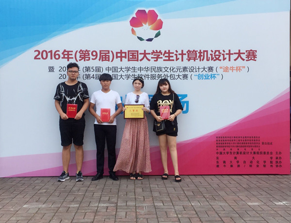 近日,2016年(第9届)中国大学生计算机设计大赛中华民族文化元素/软件服务外包总决赛在南京东南大学举办,由设计与艺术系杨越茗老师带队,李芙蓉与杨越茗任指导教师,许罡瑞、李秀东、高天怡3名学生组成的代表队与北京大学、中国人民大学、中国人民解放军大学、大连理工大学、东北大学等429所高校的1248人同台竞技,最终荣获“国赛三等奖”的优异成绩。